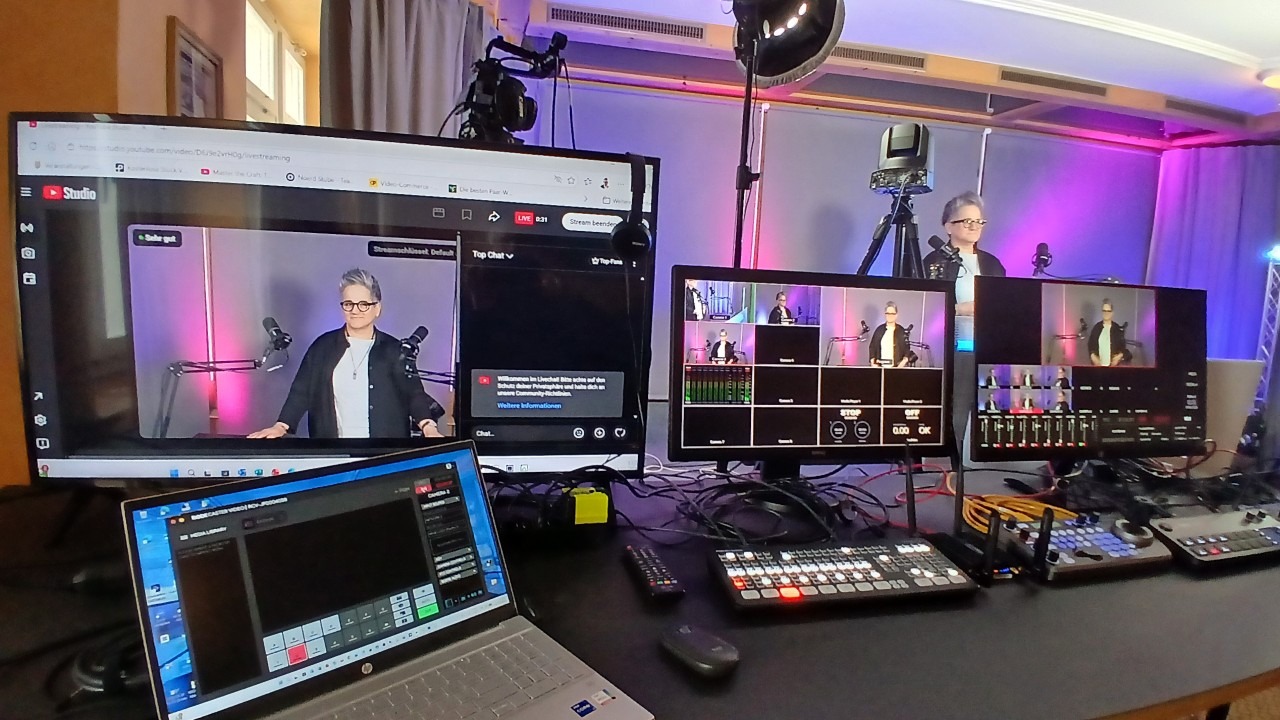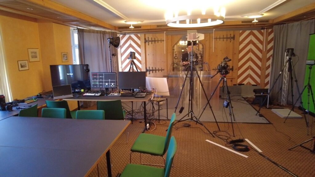 Die drei an der Holzblende montierten Displays lassen sich sehr einfach aufrollen. Zudem können die Vorhänge auf beiden Seiten des Studios mit einem Handgriff geöffnet werden. Somit ist der Zugriff auf Inhalte, die in den Kästen gelagert werden, jederzeit gewährt.